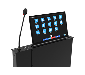 HCS-8678AD ………………无纸化多媒体升降器(一体升降式,代表单元,带 15.6 英寸 1920*1080 高分辨率 LCD,电容式触摸屏,带升降式鹅颈麦,配合 HCS-8678DBX 使用,支持表决、视频播放、多通道视频点播与广播、会议服务、网页浏览,黑色)